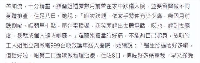 港媒称前晚(4日)联络上罗兰姐,电话中传来声线较柔弱欠中气,但对答如流,十分精灵。罗兰姐透露数月前曾在家中跌伤入院,并要留医做不同身体检查,住足八日。 她说:“那次跌倒,现在手臂还有点痛,几个月前跌倒的。那天早上七点,家里电话响,我着急赶出去听电话,哎呀,赶到客厅,我就整个人摔倒在客厅了。”罗兰姐指当时很痛,不能够自己起身,故吩咐工人姐姐立刻致召唤救护车送入医院,她续说:“医生检查了好多项目,他说好了,这样第二天回来做物理治疗,住𱅄天,给了好多药膏我,早上又擦晚上又擦这样。”